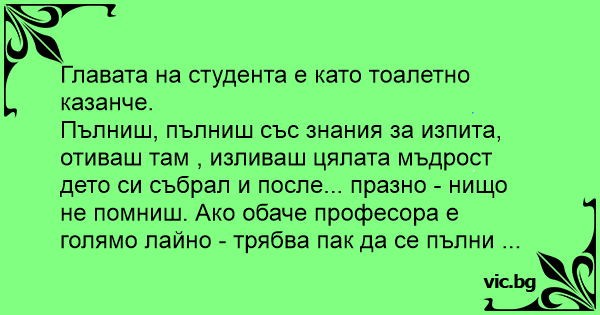 Пълниш, пълниш със знания за изпита, отиваш там , изливаш цялата мъдрост дето си събрал и после... празно - нищо не помниш. Ако обаче професора е голямо лaйнo - трябва пак да се пълни ...