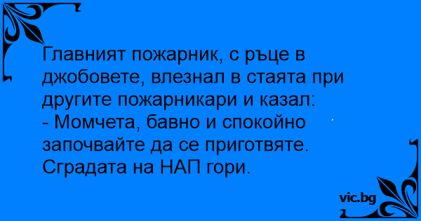 Главният пожарник, с ръце в джобовете, влезнал в стаята при другите пожарникари и казал: