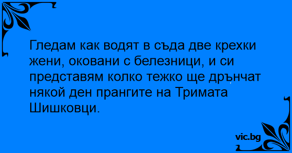 Гледам как водят в съда две крехки жени, оковани с белезници, и си представям колко тежко ще дрънчат някой ден прангите на Тримата Шишковци.