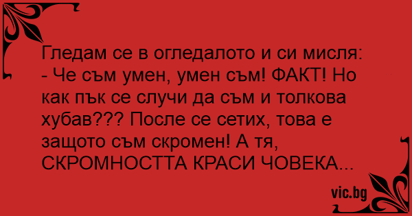 - Че съм умен, умен съм! ФАКТ! Но как пък се случи да съм и толкова хубав??? После се сетих, това е защото съм скромен! А тя, СКРОМНОСТТА КРАСИ ЧОВЕКА...