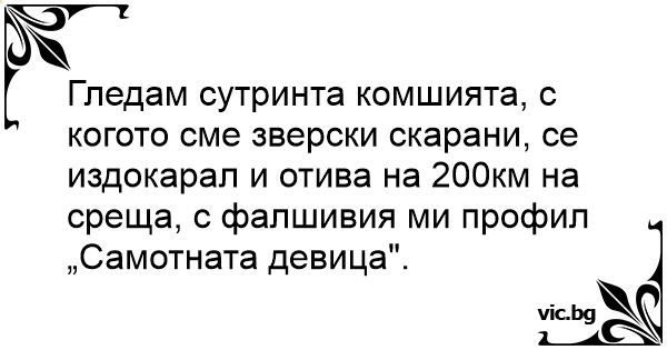 Гледам сутринта комшията, с когото сме зверски скарани, се издокарал и отива на 200км на среща, с фалшивия ми профил „Самотната девица".