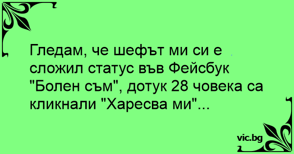 Гледам, че шефът ми си е сложил статус във Фейсбук "Болен съм", дотук 28 човека са кликнали "Харесва ми"...