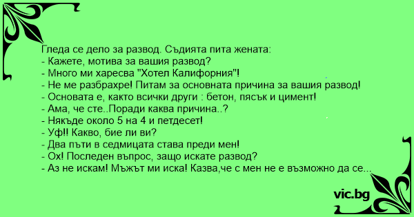 - Ох! Последен въпрос, защо искате развод?