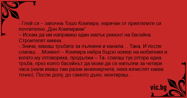 - Значи, махаш тръбата за пълнене и канала… Така. И после слагаш….Момент – Компира набра бързо номер на мобилния и когато му отговориха, продължи – Та- слагаш тук отгоре една тръба, през която басейнът да може да се напълни за четири часа (нали имаш там разни инженерчета, нека изчислят каква точно). После долу, до самото дъно, монтираш друга, през която да може да се изпpaзни за осем часа – ще я сметнете там. Дотук ясно ли е?