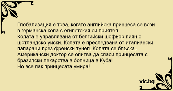 Глобализация е това, когато английска принцеса се вози в германска кола с египетския си приятел.