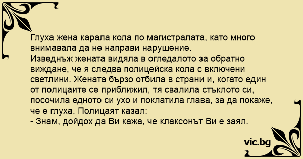 Изведнъж жената видяла в огледалото за обратно виждане, че я следва полицейска кола с включени светлини. Жената бързо отбила в страни и, когато един от полицаите се приближил, тя свалила стъклото си, посочила едното си ухо и поклатила глава, за да покаже, че е глуха. Полицаят казал: