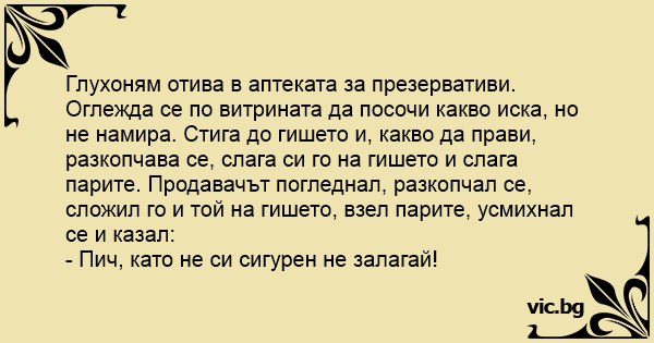 Глухоням отива в аптеката за презервативи.