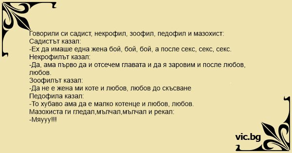 Intr-o celula de inchisoare erau un zoofil, un necrofil, un sadic si un masochist. Plictisindu-se ei la un moment dat incepe zoofilu': - Mama, de-as avea acuma o pisica! mama ce i-as face, pe toate...