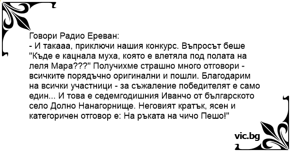 - И такааа, приключи нашия конкурс. Въпросът беше "Къде е кацнала муха, която е влетяла под полата на леля Мара???" Получихме страшно много отговори - всичките порядъчно оригинални и пошли. Благодарим на всички участници - за съжаление победителят е само един... И това е седемгодишния Иванчо от българското село Долно Нанагорнище. Неговият кратък, ясен и категоричен отговор е: На ръката на чичо Пешо!"