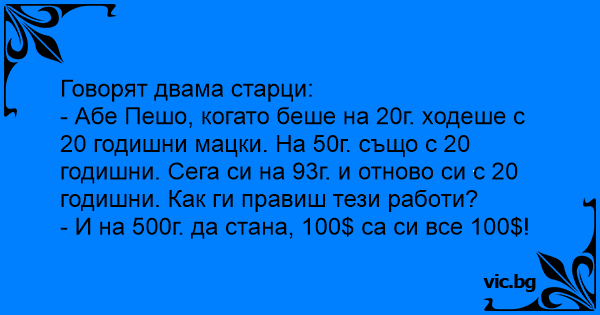 - Абе Пешо, когато беше на 20г. ходеше с 20 годишни мацки. На 50г. също с 20 годишни. Сега си на 93г. и отново си с 20 годишни. Как ги правиш тези работи?