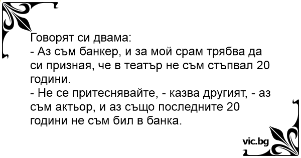 - Не се притеснявайте, - казва другият, - аз съм актьор, и аз също последните 20 години не съм бил в банка.