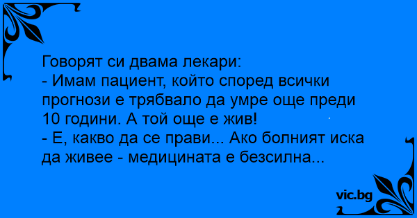 Розмовляють два обметаних лікаря: — Я мав одного хворого, який за всіма прогнозами мав померти ще десять років тому, а він усе ще живий. — Так, таке буває. Це ще раз доводить, що коли хворий справді хоче жити, то медицина безсила. Ако един пациент иска да живее, Современа медицина