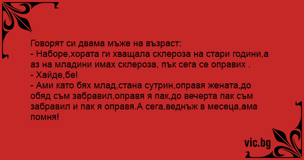 - Ами като бях млад,стана сутрин,оправя жената,до обяд съм забравил,оправя я пак,до вечерта пак съм забравил и пак я оправя.А сега,веднъж в месеца,ама помня!
