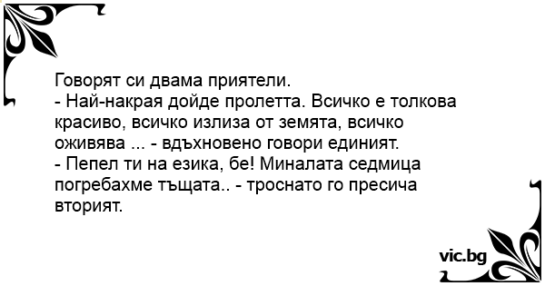 - Пепел ти на езика, бе! Миналата седмица погребахме тъщата.. - троснато го пресича вторият.