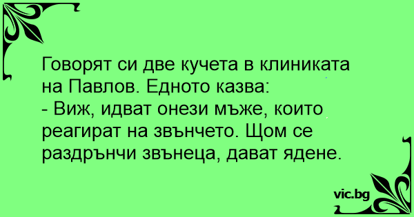 Говорят си две кучета в клиниката на Павлов. Едното казва: