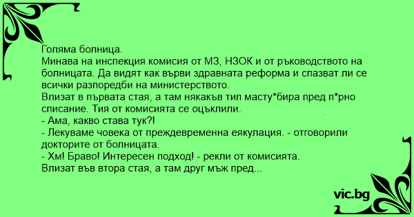 - Лекуваме човека от преждевременна еякулация. - отговорили докторите от болницата.