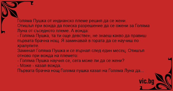 Отишъл при вожда да поиска разрешение да се ожени за Голяма Луна от съседното племе. А вожда: