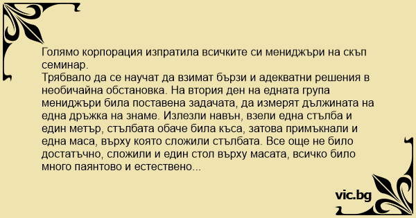 Всички започнали да говорят едновременно, да предлагат решения, станала страшна говорилня. В този момент покрай тях минал един инженер. Погледнал ги, послушал ги, издърпал дръжката на знамето от земята, сложил я легнала и измерил дължината от край до край, написал резултата на едно листче и заедно с дръжката го бутнал в ръцете на един от мениджърите. После си продължил по пътя. Едва се скрил зад ъгъла и единият от топ-мениджърите казал: