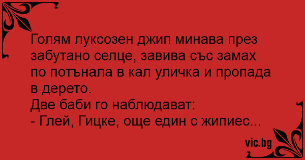 Голям луксозен джип минава през забутано селце, завива със замах по потънала в кал уличка и пропада в дерето.