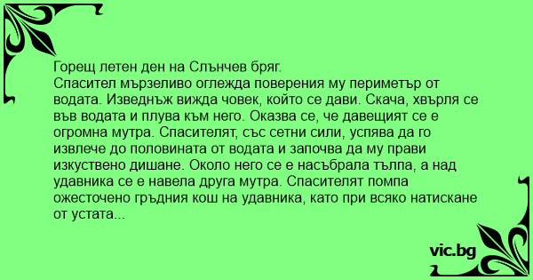 Спасител мързеливо оглежда поверения му периметър от водата. Изведнъж вижда човек, който се дави. Скача, хвърля се във водата и плува към него. Оказва се, че давещият се е огромна мутра. Спасителят, със сетни сили, успява да го извлече до половината от водата и започва да му прави изкуствено дишане. Около него се е насъбрала тълпа, а над удавника се е навела друга мутра. Спасителят помпа ожесточено гръдния кош на удавника, като при всяко натискане от устата му излиза фонтан морска вода. Спасителят помпа, помпа, а водата хвърчи ли хвърчи. След 15 минути другата мутра го потупва по рамото: