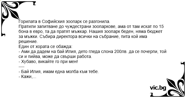 Пратили запитване до чуждестрани зоопаркове, ама от там искат по 15 бона в евро, та да пратят мъжкар. Нашия зоопарк беден, няма бюджет за мъжки. Събира директора всички на събрание, пита кой има решение.