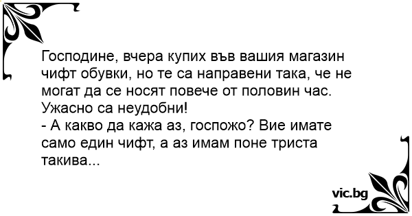 - А какво да кажа аз, госпожо? Вие имате само един чифт, а аз имам поне триста такива...