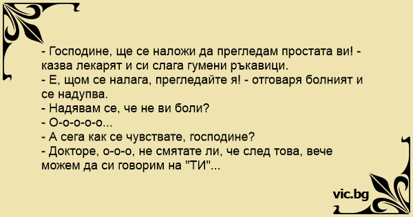 - Господине, ще се наложи да прегледам простата ви! - казва лекарят и си слага гумени ръкавици.