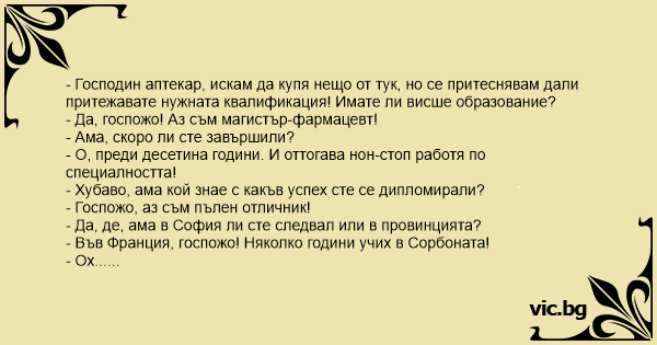 - Господин аптекар, искам да купя нещо от тук, но се притеснявам дали притежавате нужната квалификация! Имате ли висше образование?