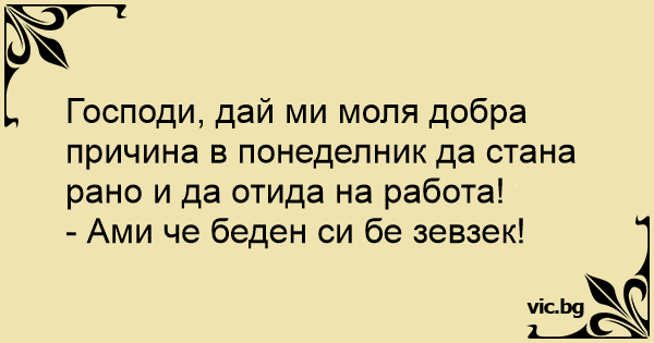 Господи, дай ми моля добра причина в понеделник да стана рано и да отида на работа!<br />- Ами че беден си бе зевзек!