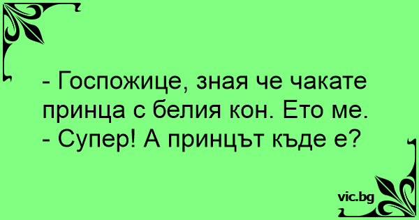 — Дівчина, я знаю, адже ви ж давно чекаєте принца на білому коні? — Так. - Ну от. Я прийшов. — Круто, а де принц?