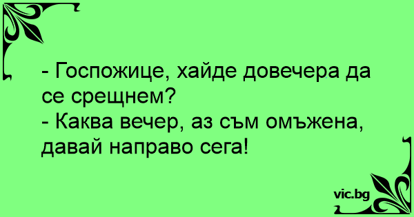 - Каква вечер, аз съм омъжена, давай направо сега!