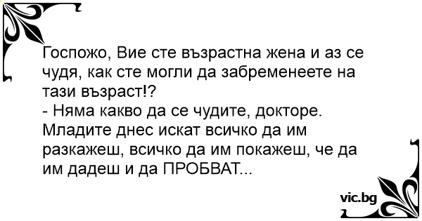 - Няма какво да се чудите, докторе. Младите днес искат всичко да им разкажеш, всичко да им покажеш, че да им дадеш и да ПРОБВАТ...