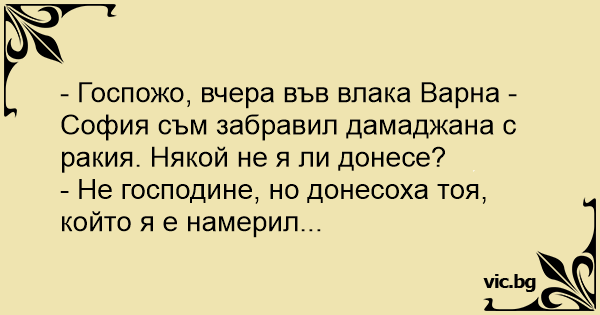 - Госпожо, вчера във влака Варна - София съм забравил дамаджана с ракия. Някой не я ли донесе?