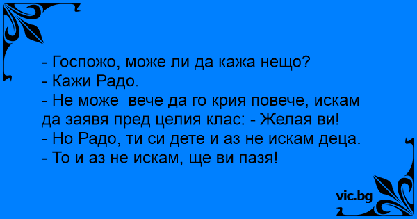 Petriukas parašė mokytojai laiškelį: "Aš jus myliu" . Mokytoja jam atsakė: "Nekenčiu vaikų" . Petriukas: "Garantuoju, vaikų nebus".