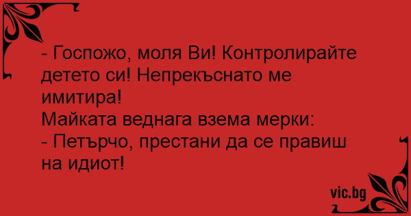 Две майки се разхождат с дъщерите си. Едната майка казва на другата: