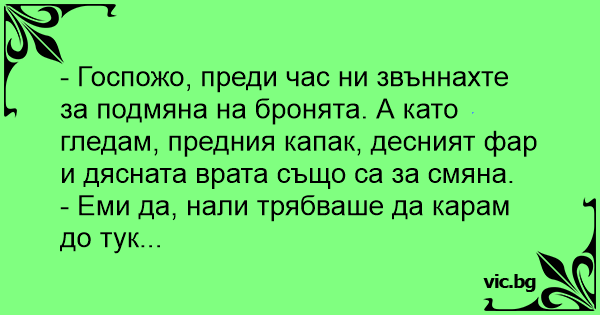 - Госпожо, преди час ни звъннахте за подмяна на бронята. А като гледам, предния капак, десният фар и дясната врата също са за смяна.