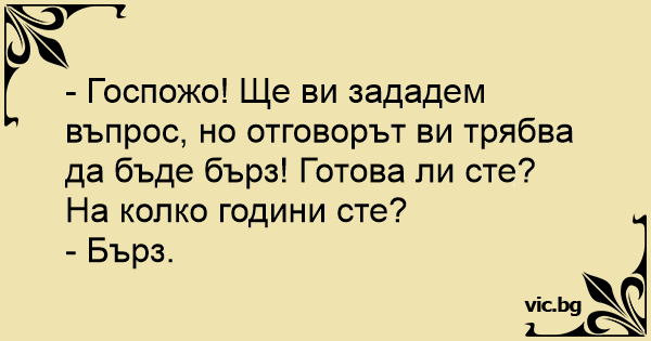 - Госпожо! Ще ви зададем въпрос, но отговорът ви трябва да бъде бърз! Готова ли сте? На колко години сте?
