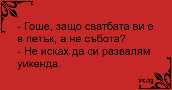 - Gheorghe, de ce ți-ai pus nunta vineri? - N-am vrut să-mi stric weekendul.