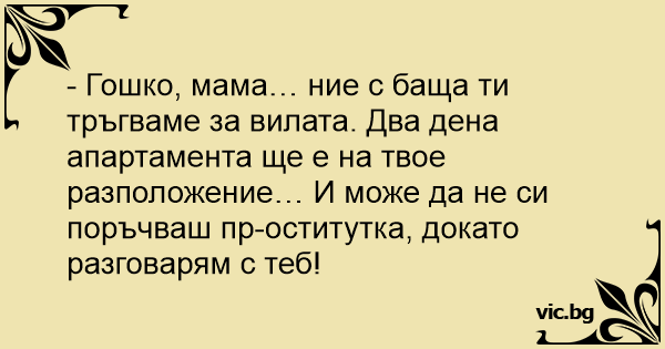 - Гошко, мама… ние с баща ти тръгваме за вилата. Два дена апартамента ще е на твое разположение… И може да не си поръчваш пpoctиtуtka, докато разговарям с теб!