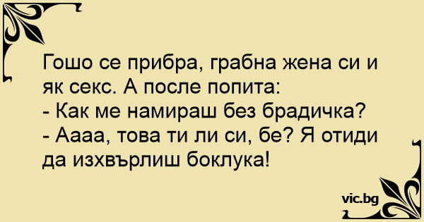 Гошо се прибра, грабна жена си и як cekc. А после попита:
