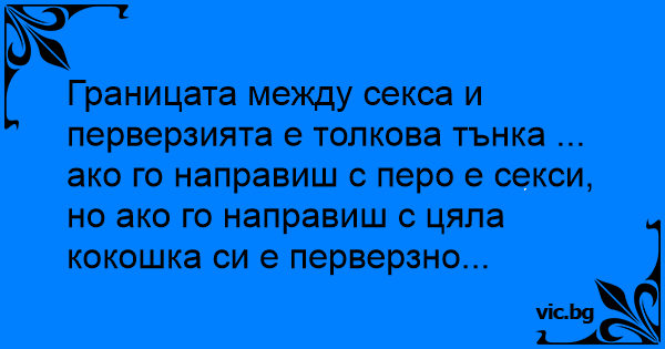 - Што е разликата меѓу еротика и перверзија? - Еротика е да користиш пердув, а перверзија е да користиш кокошка.