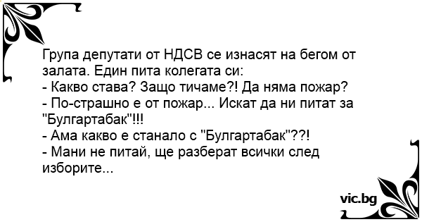 Група депутати от НДСВ се изнасят на бегом от залата. Един пита колегата си: