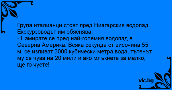 Екскурсовод: — Панове! Прошу уваги! Якщо пані на хвилинку замовкнуть, ми почуємо моторошний рев Ніагарського водоспаду...