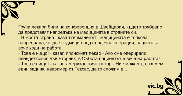 - В моята страна - казал германецът - медицината е толкова напреднала, че две седмици след сърдечна операция, пациентът вече ходи на работа.