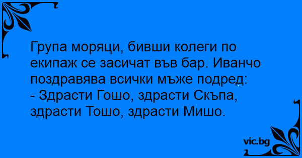 Група моряци, бивши колеги по екипаж се засичат във бар. Иванчо поздравява всички мъже подред: