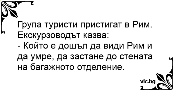 Група туристи пристигат в Рим. Екскурзоводът казва: