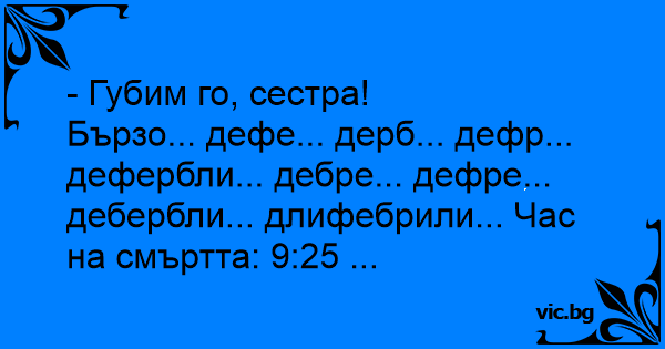 Бързо... дефе... дерб... дефр... дефербли... дебре... дефре... дебербли... длифебрили... Час на смъртта: 9:25 ...
