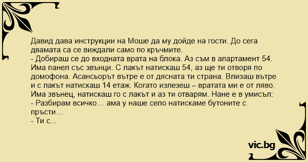 - Добираш се до входната врата на блока. Аз съм в апартамент 54. Има панел със звънци. С лакът натискаш 54, аз ще ти отворя по домофона. Асансьорът вътре е от дясната ти страна. Влизаш вътре и с лакът натискаш 14 етаж. Когато излезеш – вратата ми е от ляво. Има звънец, натискаш го с лакът и аз ти отварям. Нане е в умисъл: