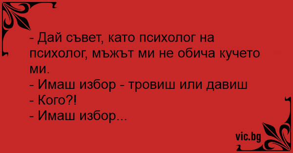 Кажи ми като психолог на психолог, какво да правя: мъжът ми не обича кучето ми! - Доктор посоветуй, что мне делать: муж не любит мою собаку! - У Вас есть выбор - отравить или утопить. - Кого?! - Ну, у Вас есть выбор.