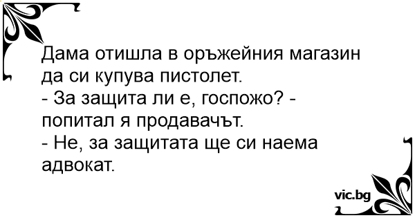Μια κυρία μπαίνει σε ένα κατάστημα όπλων. > - Θα ήθελα να αγοράσω ένα πιστόλι, παρακαλώ. > - Το θέλετε για υπεράσπιση; > - Ω, όχι! Την υπεράσπιση θα την αναλάβει ο δικηγόρος μου!